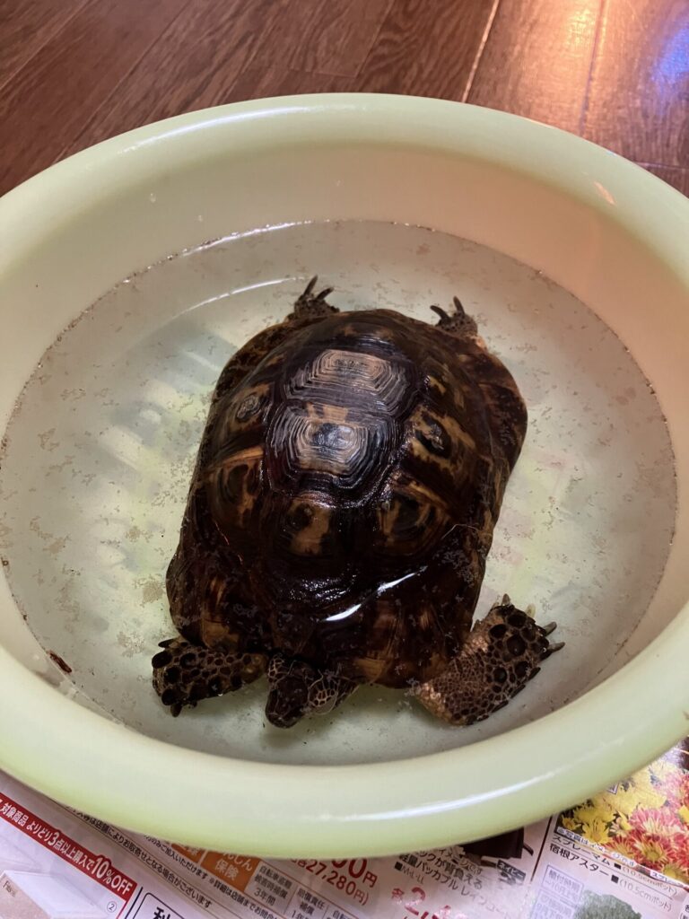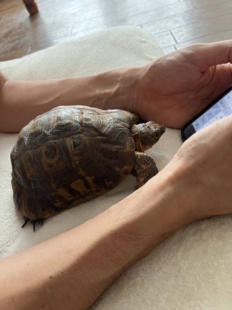 当時飼育していたハムスターの餌を買いにペットショップに行った際に、「リクガメ入荷!」のポップが貼られたケージの中をウロウロしていた小さなギリシャリクガメ(WC)が、たまたま店員さんとの話の流れで「触ってみます?」となり、奥さんの手のひらに乗せてもらった瞬間、そのギリシャリクガメは粗相。大失禁。