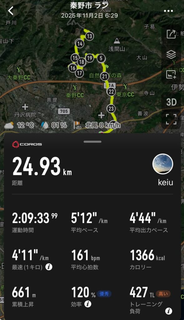 登りは呼吸が荒れ過ぎない程度にリズム良く登る事、下りは脚をクルクル回しつつといったイメージで走り、まぁまぁいい感じ。