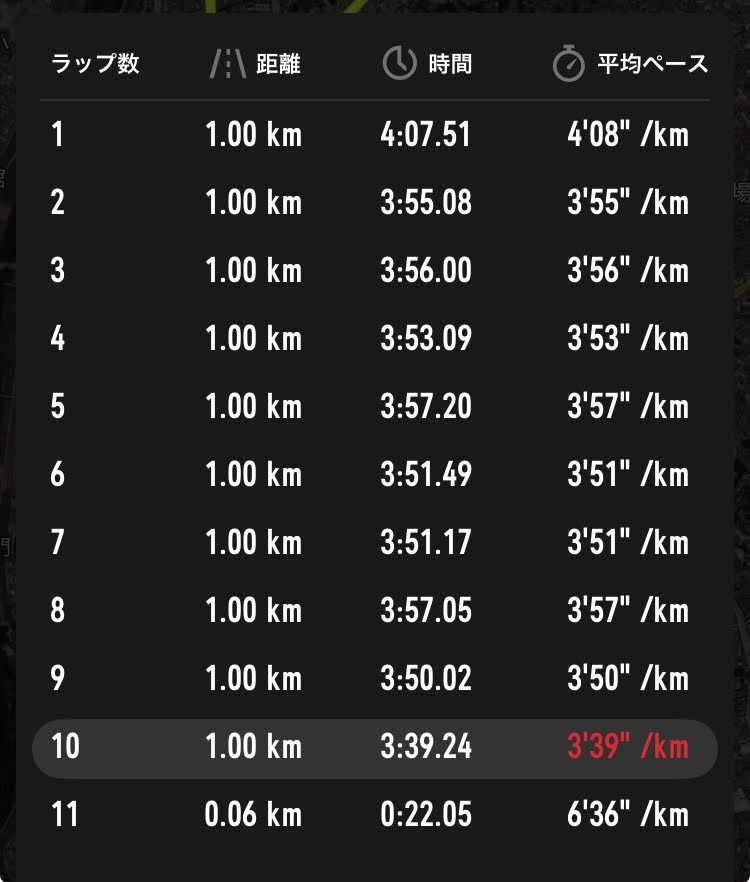 これは、個人的にはかなり驚きのタイムで、トレーニングでは3kmでも、5kmでも走ったことのないタイム。