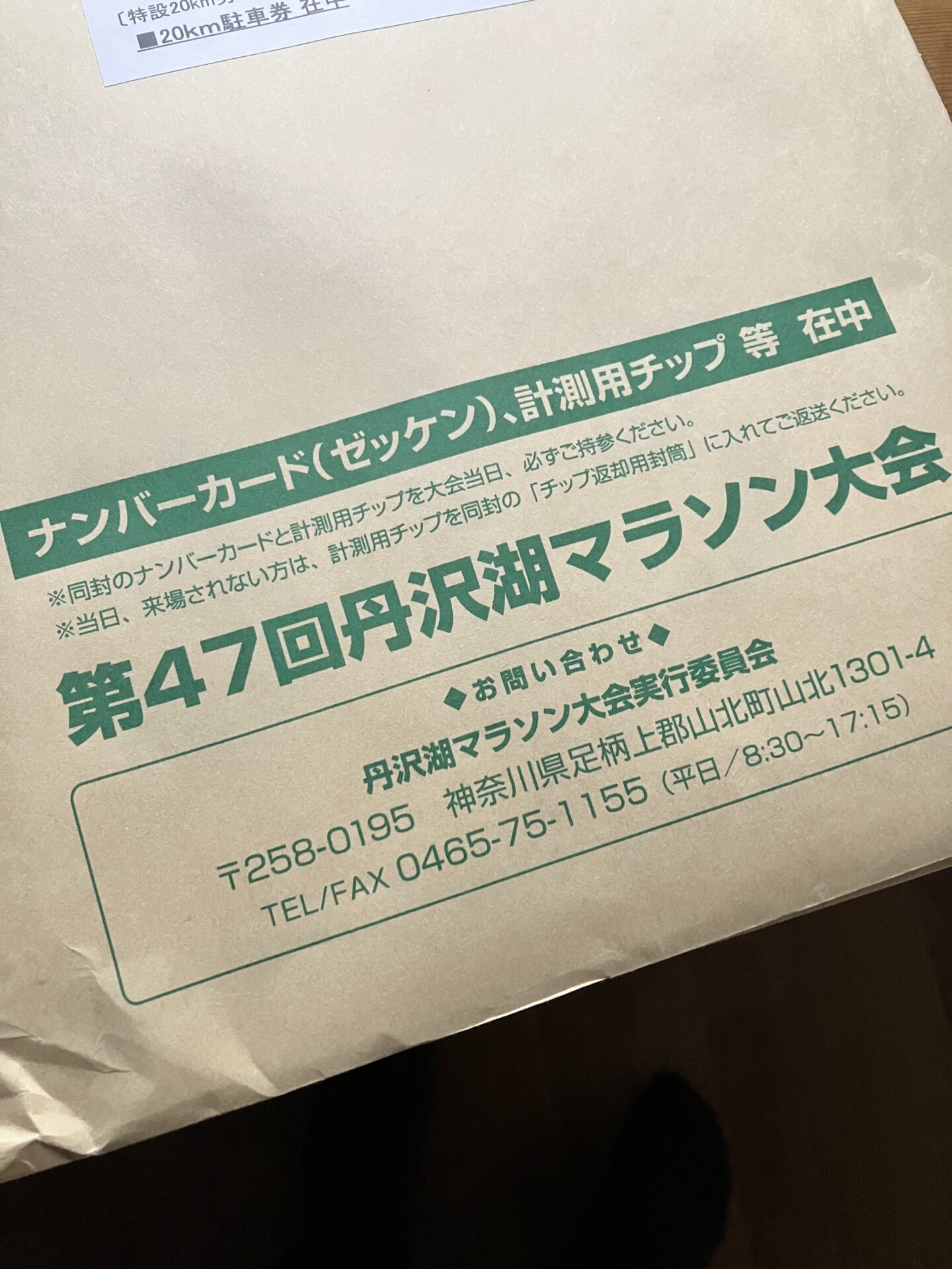 快走した流山ロードレースの余韻に浸る間もなく、丹沢湖マラソンのゼッケン等が届いた。