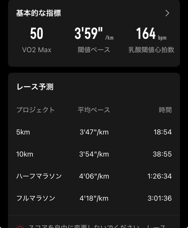 先日、何の気なく久しぶりにCOROSアプリの「レース予測」を見てみたら、とんでもない数字が出ていた。