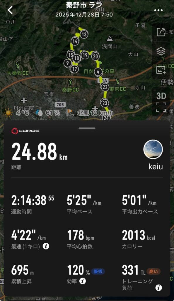 - ヤビツ峠走24km:2時間14分(平均ペース:5:25/km)