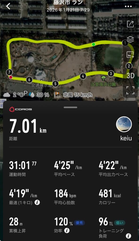 館山若潮マラソン前最後の休日・・・ということで、最後のポイント練は速めに体を動かすイメージを付けておこう・・・ということでちょっと速めに7kmをやってきました!