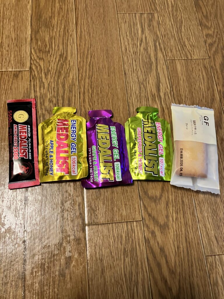 そんな感じの補給計画。小麦アレルギーがあるのでエイドのものはバナナと飲み物位しか摂れないので、結構補給はシンプル。