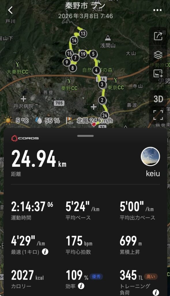 - ヤビツ峠走24km:2時間14分(平均ペース:5:24/km)