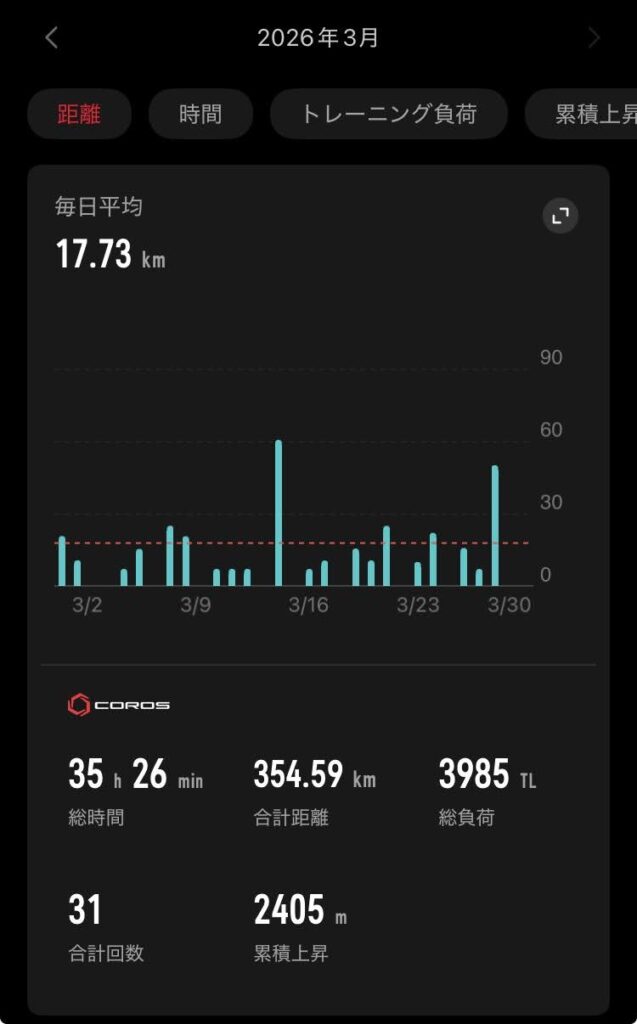 色々なことがあった3月だったけれど、終わってみれば350km越えと結構な距離を走れていたし、ロングジョグも峠走もやることが出来た。